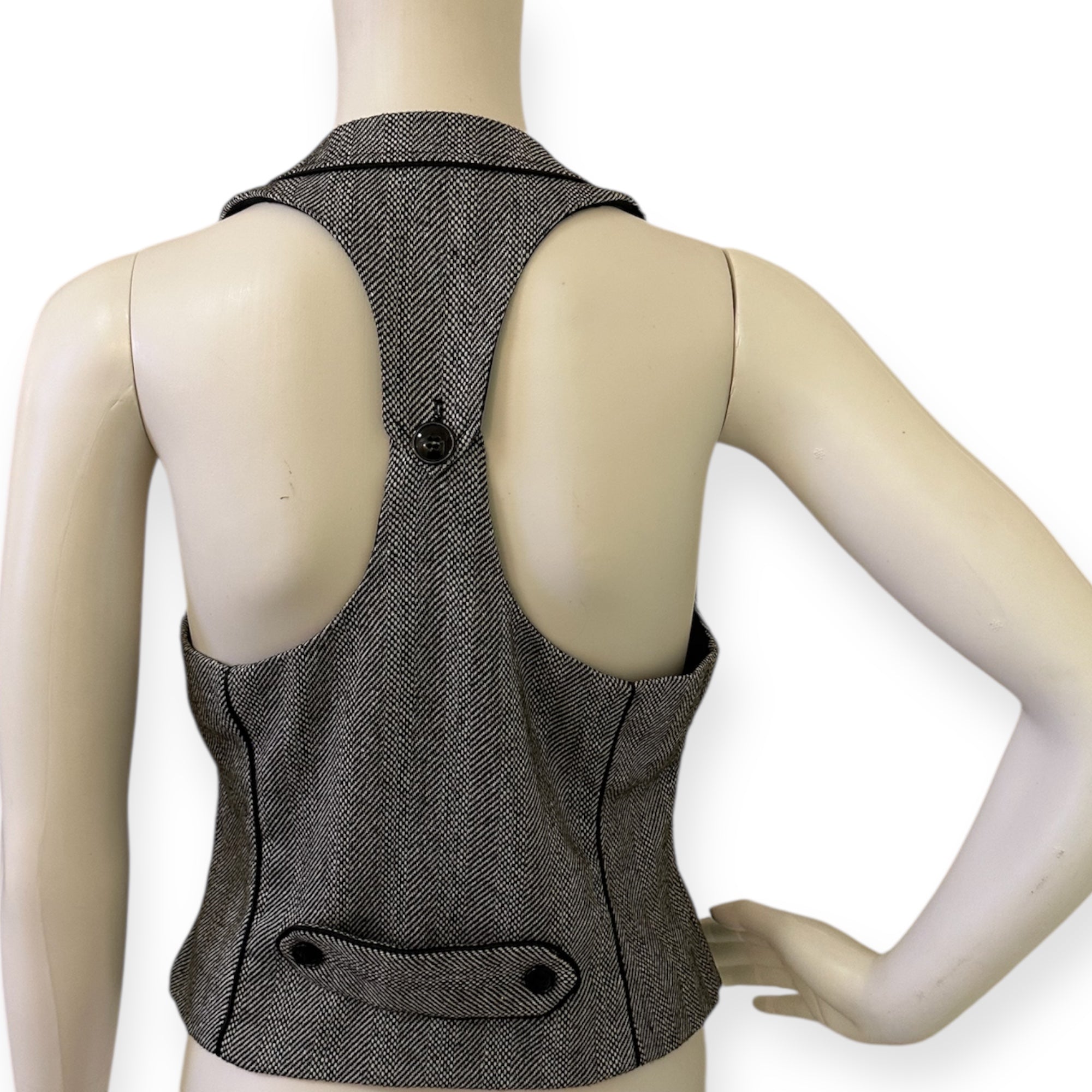 Chic gray herringbone vest featuring black buttons. Perfect for layering.