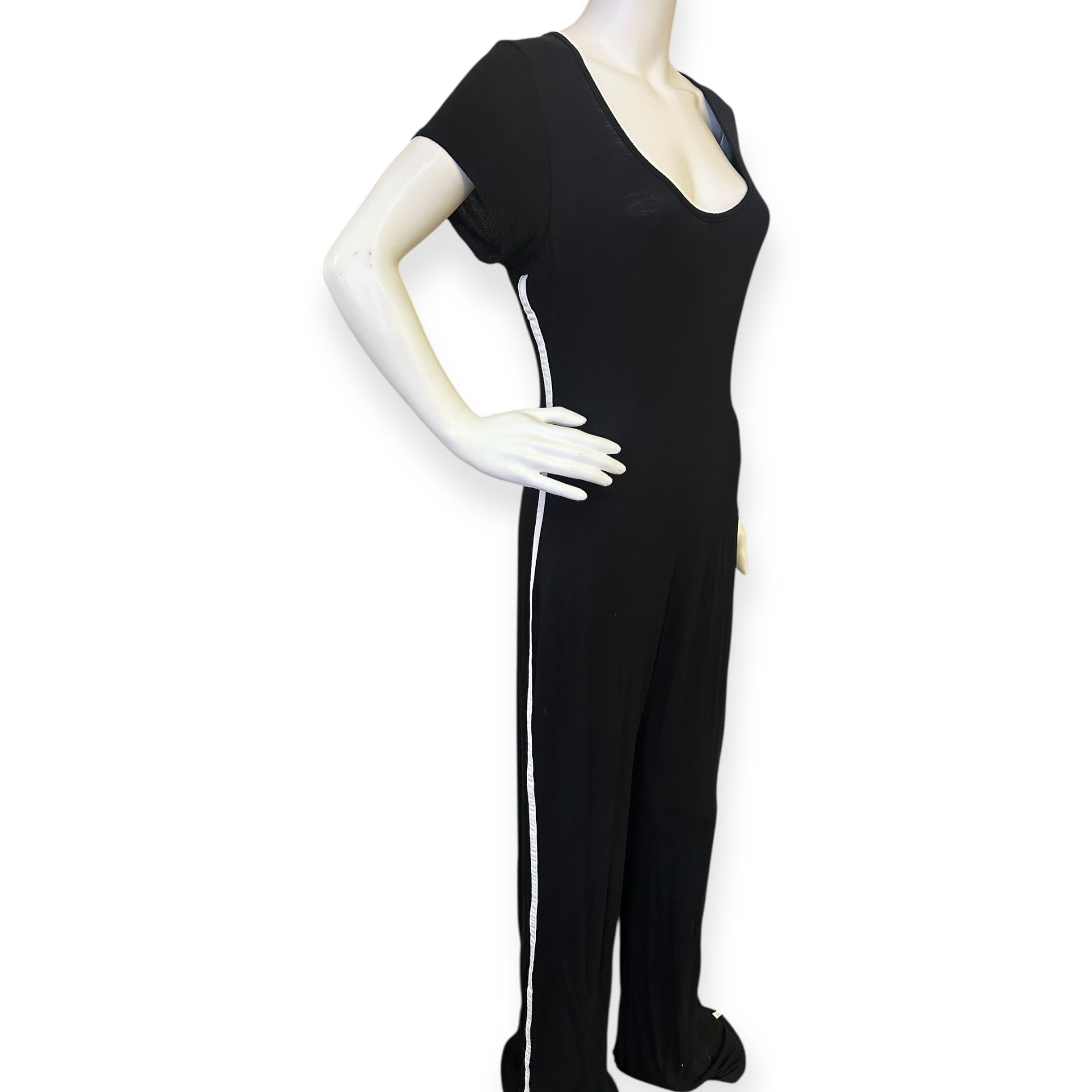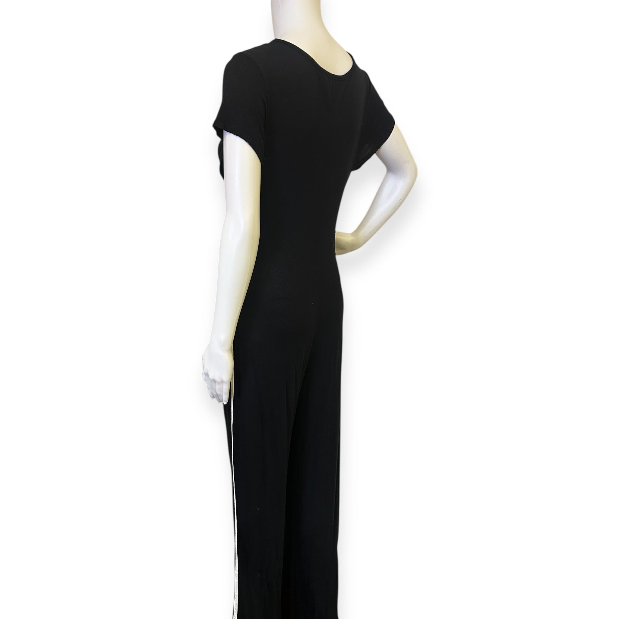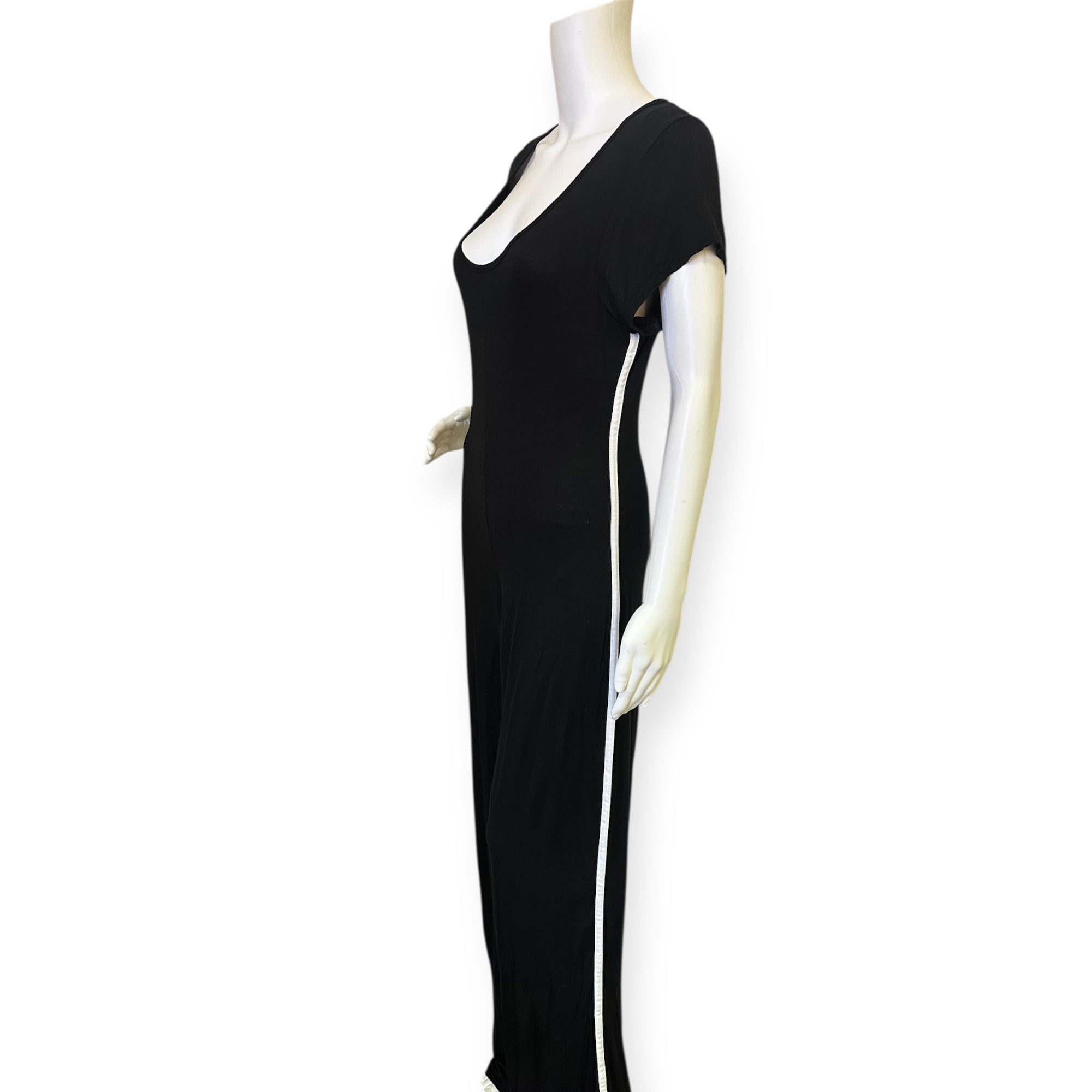 Elevate your style with this sleek black jumpsuit featuring a chic white stripe. Perfect for any occasion, this jumpsuit offers both comfort and elegance.