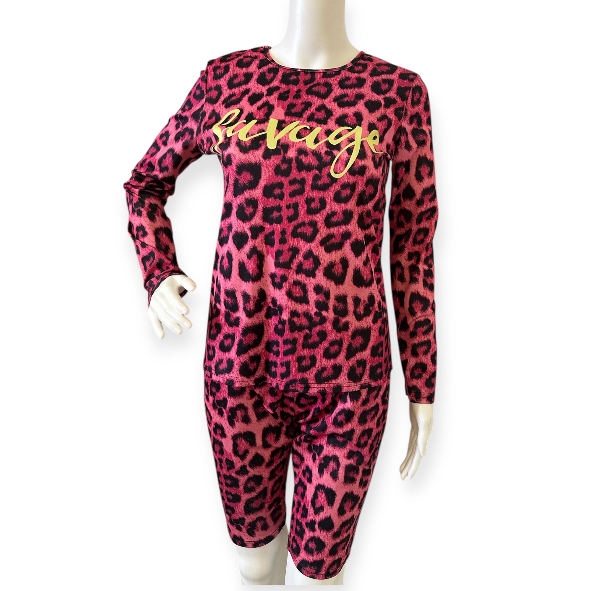 Stylish pink leopard print set with 'Savage' text. Includes top and shorts.