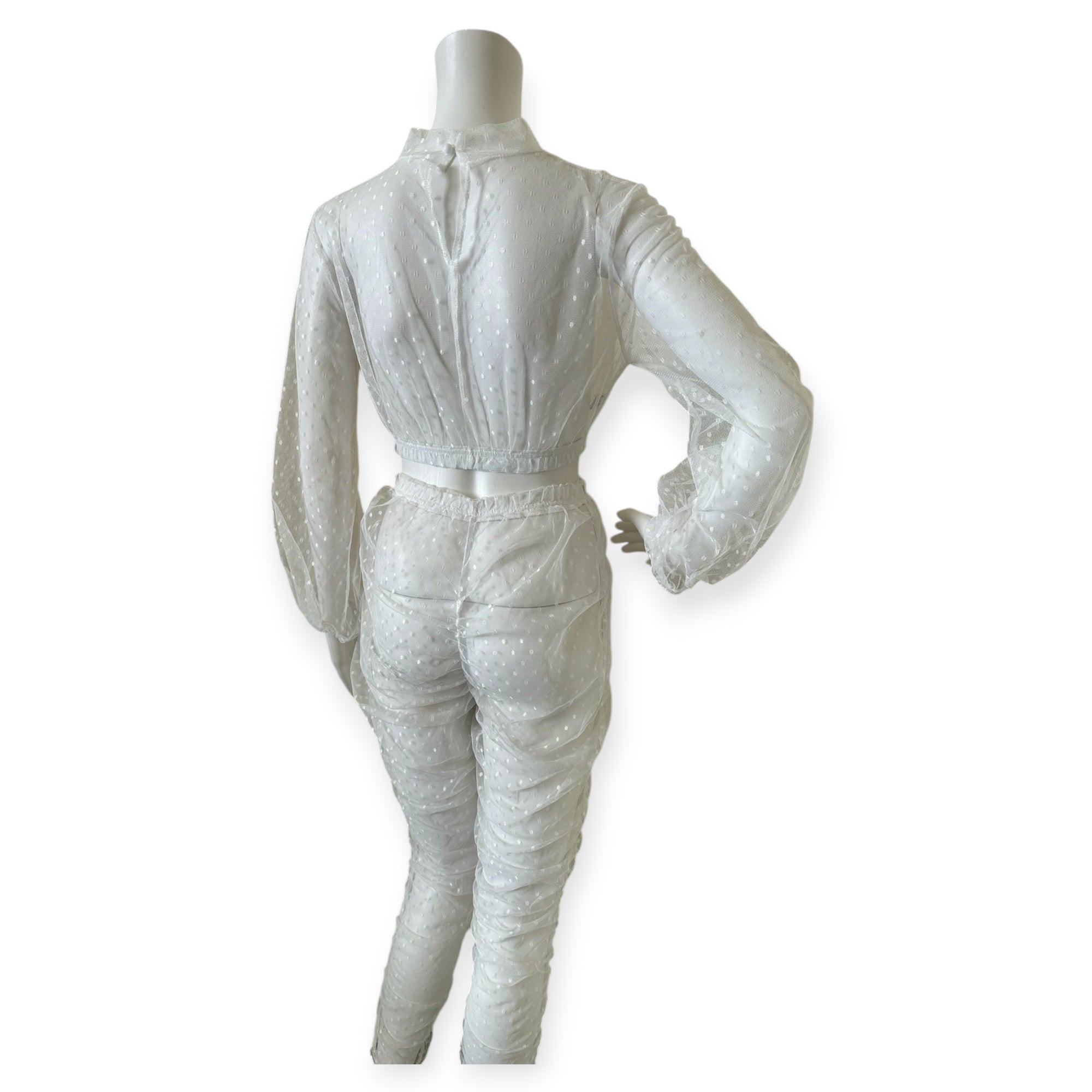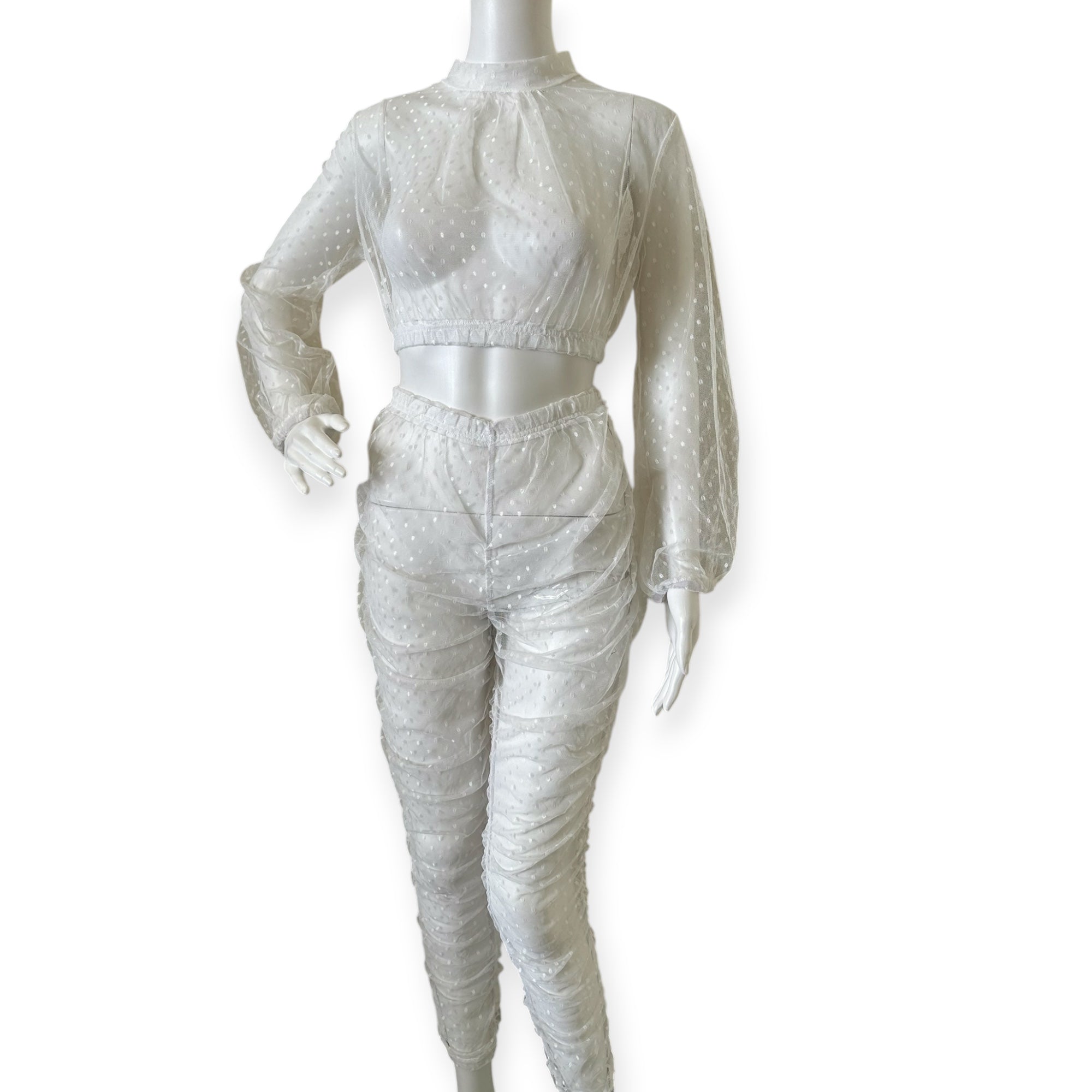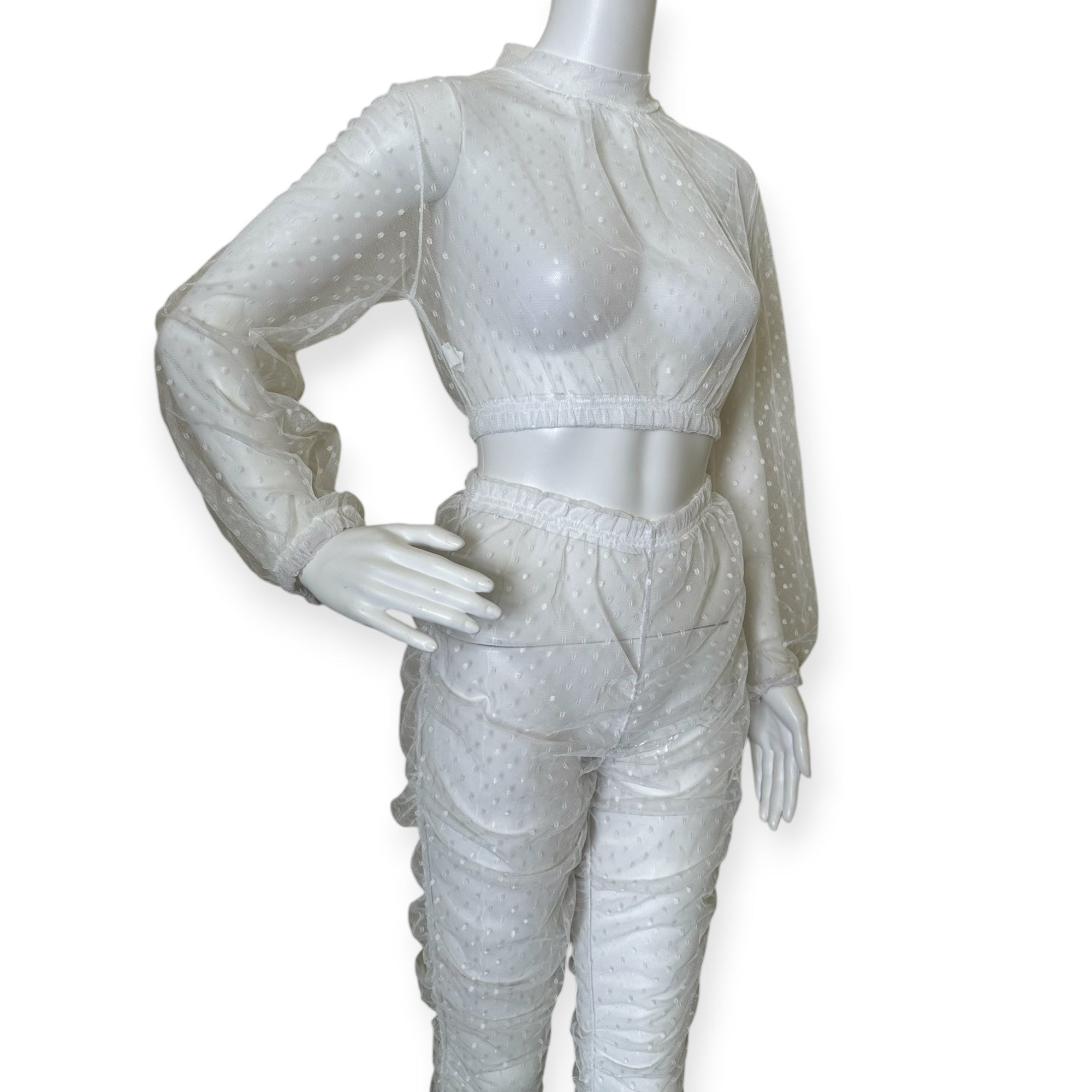 Elegant sheer white two-piece set with long sleeves and high waist pants. Perfect for a chic look.